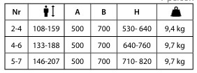 2-4 / 108-159 cm, 4-6 / 133-188 cm, 5-7 / 146-207 cm