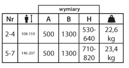 | zakres wzrostu użytkownika | 2-4 / 108-159 cm, 4-6 / 133-188 cm, 5-7 / 146-207 cm |