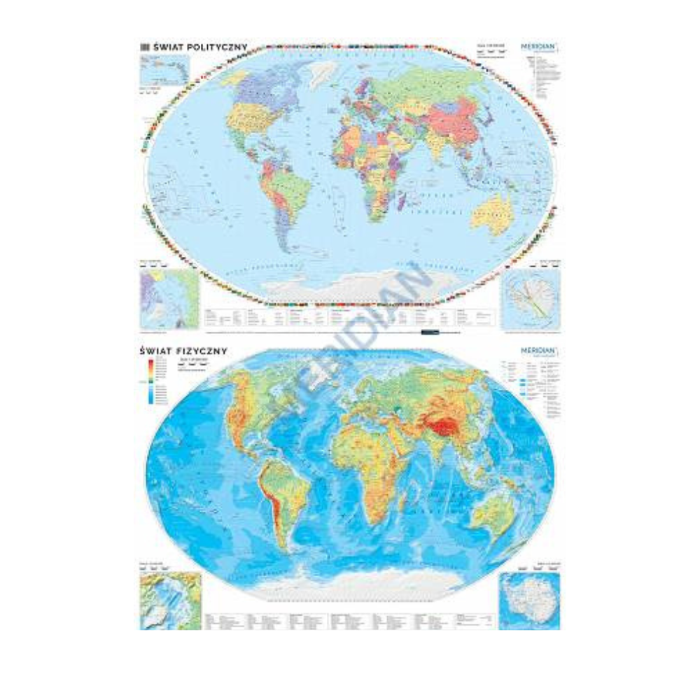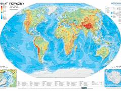 Ścienna mapa szkolna przedstawiająca ukształtowanie powierzchni świata. Klasyczna, poziomicowa mapa fizyczna została wzbogacona dodatkowo o informacje na temat ochrony środowiska. Umieszczone są na niej rezerwaty biosfery wpisane na światową listę dziedzictwa UNESCO, a ich lista wypisana jest pod mapą. W treści mapy znajdują się również prądy morskie, z podziałem na ciepłe i zimne, formy dna oceanicznego, punkty wysokościowe (góry, wulkany), głębokości, depresje, granice kontynentów, oceanów oraz podział na strefy czasowe.